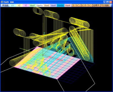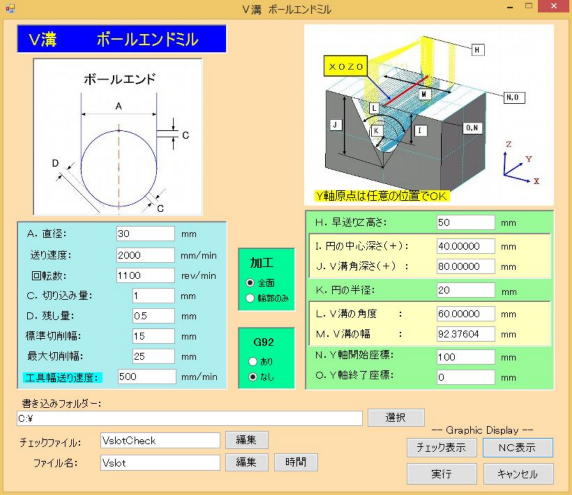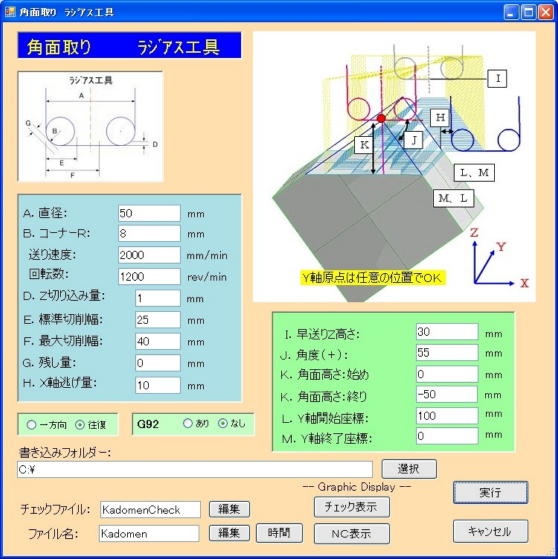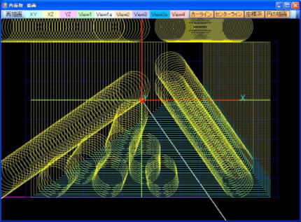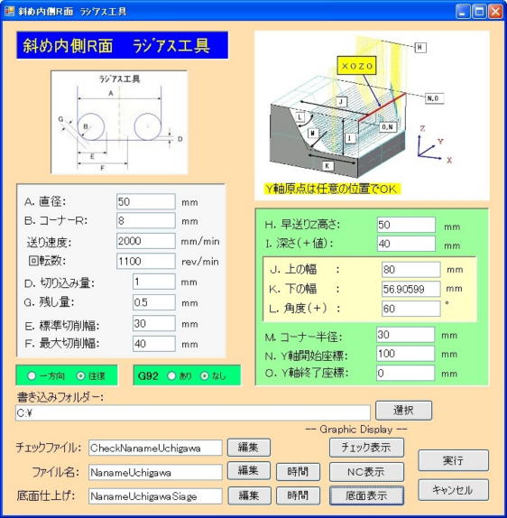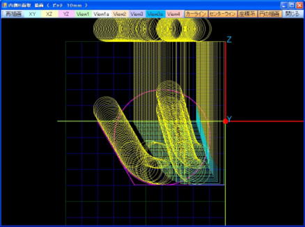 「NC表示」 水色は工具中心軌跡 黄色の円はチップの径