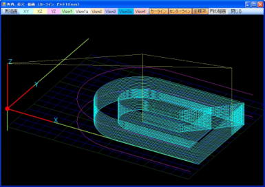 | ≪共通機能≫ ◎1度に3本のNCデータを作成します。 @荒取りチェック用NCデータ …… 確認したい位置だけを移動する。 A荒取りNCデータ …… @を実行した後、無人加工が可能 B仕上NCデータ …… Aを実行した後、無人加工が可能 ◎斜め切込(ランピング加工)ができます。 ◎XY平面で転んでいてもOKです。 ◎荒取りと仕上のそれぞれの加工時間と切削長を表示します。 ◎NCデータの作図確認ができます。 ◎NCコードの表示・編集ができます。 |