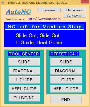【 1 side 】 Slide Diagonal line Plunging 【 2 side 】 L guide 【 3 side 】 Heel guilde ≪Common feature≫ ◎ It creates 4 NC data at the same time. @ NC data for check roughing cut …… It moves from above a surface. A NC data for roughing cut …… After @ You can move NC machine without man. 【It cut from above several o pace with a radius tool.】 B NC data for check finishing cut …… It moves from above a surface. C NC data for finishing cut …… After B You can move NC machine without man. 【 It cut a side with a spiral end-mill.】 ◎ It displays time and length of cut. ◎ It is possible to display NC data. ◎ It is possible to edit NC data. |
